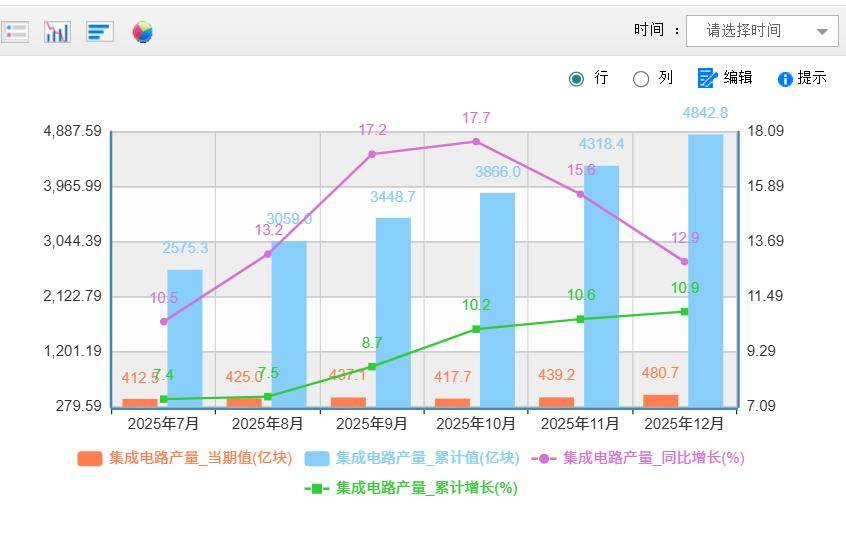 先说芯片制造方面,按照国家统计局的官网数据显示,2025年中国一共制造芯片是4842.8亿块,同比增长了12.9%,创下新纪录。