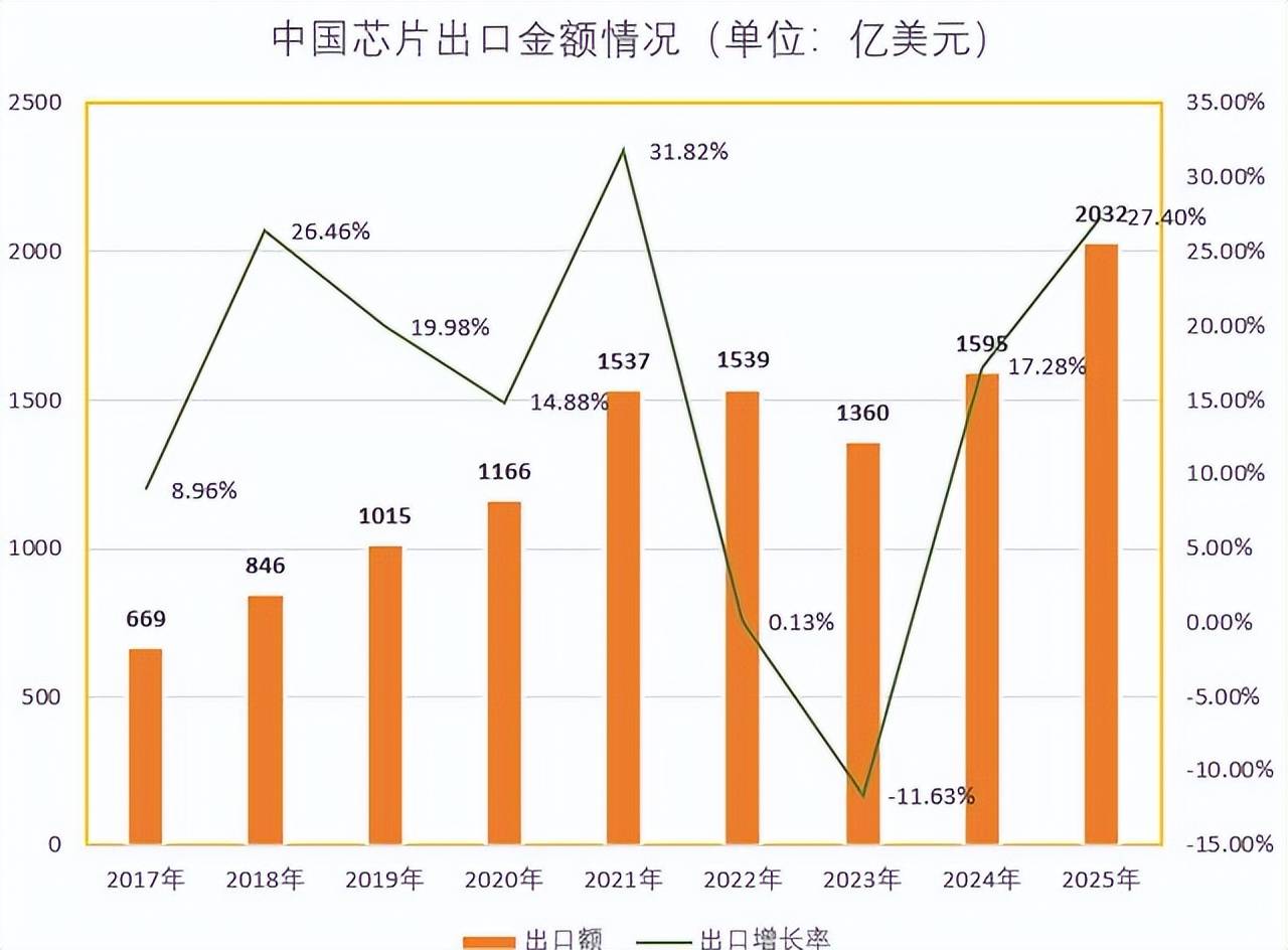 按照海关数据,2025年,中国向海外出口芯片一共是3495亿个,增长17.4%,算下来,相当于每天出口9.6亿颗,另外按照金额来算的线%,算下来是每天出口芯片40亿元左右。