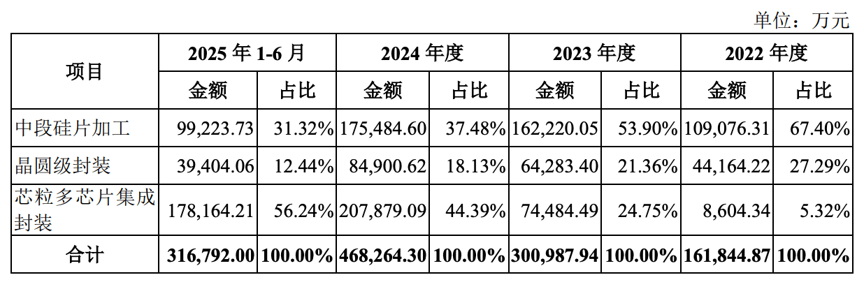 同样在2024年,芯粒多芯片集成封装首次成为盛合晶微第一大业务:2024年贡献了44.39%营业收入,2025年上半年贡献了56.24%营业收入。